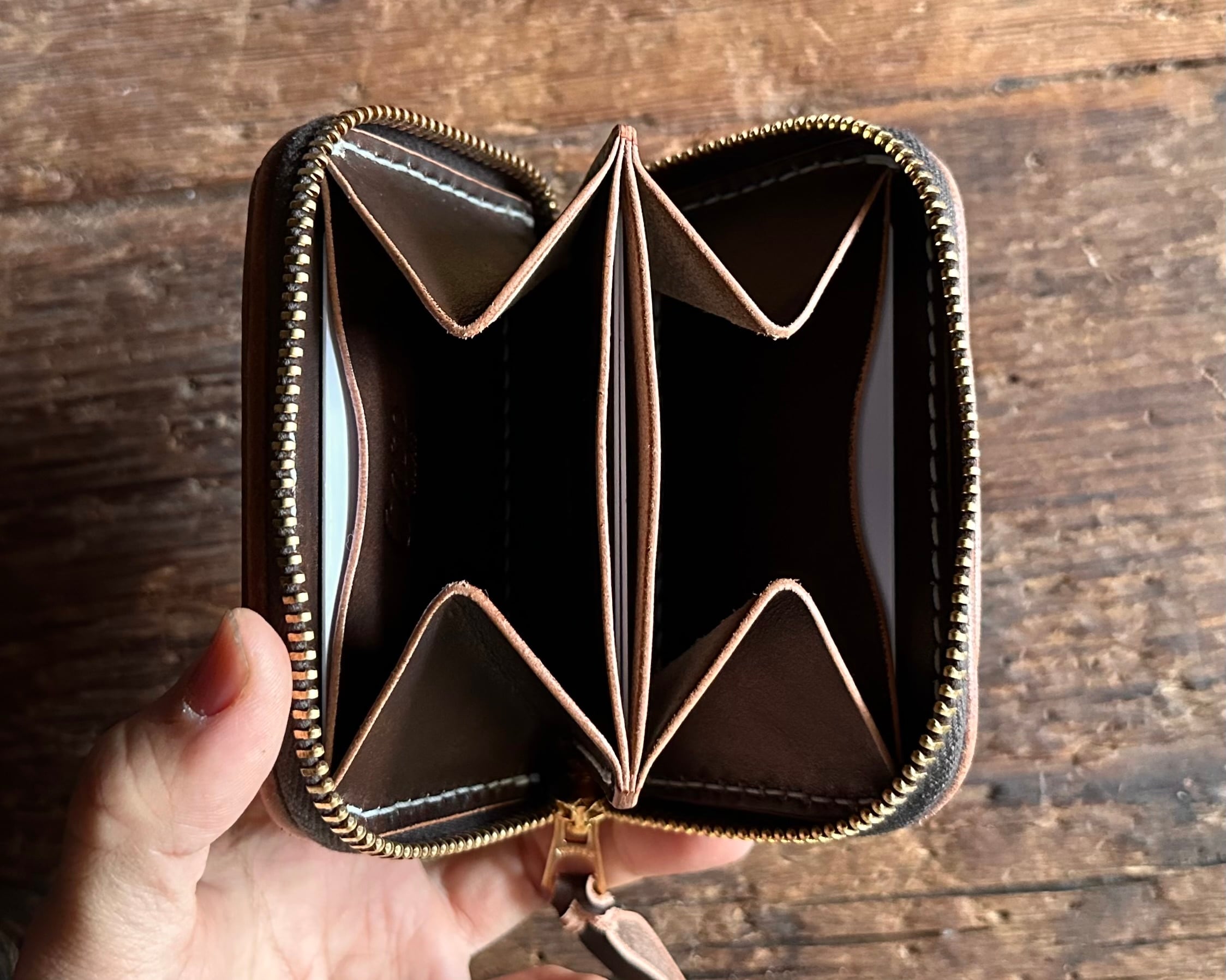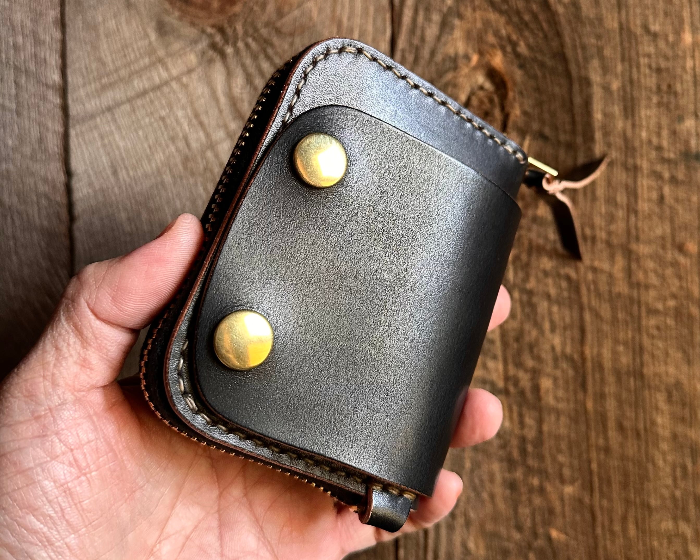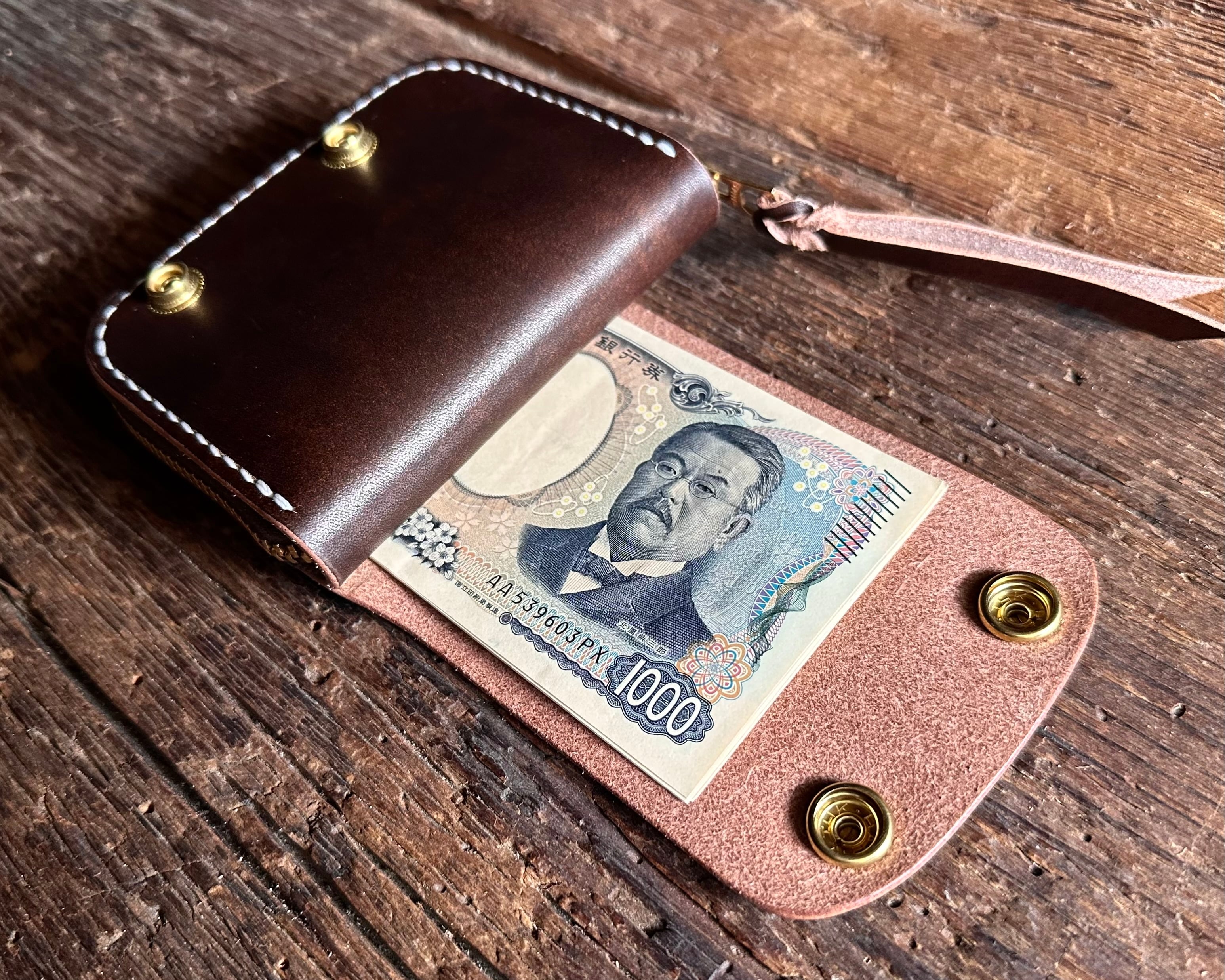 オールハンドメイド総手縫いで仕上げたラウンドジップミニウォレットです。