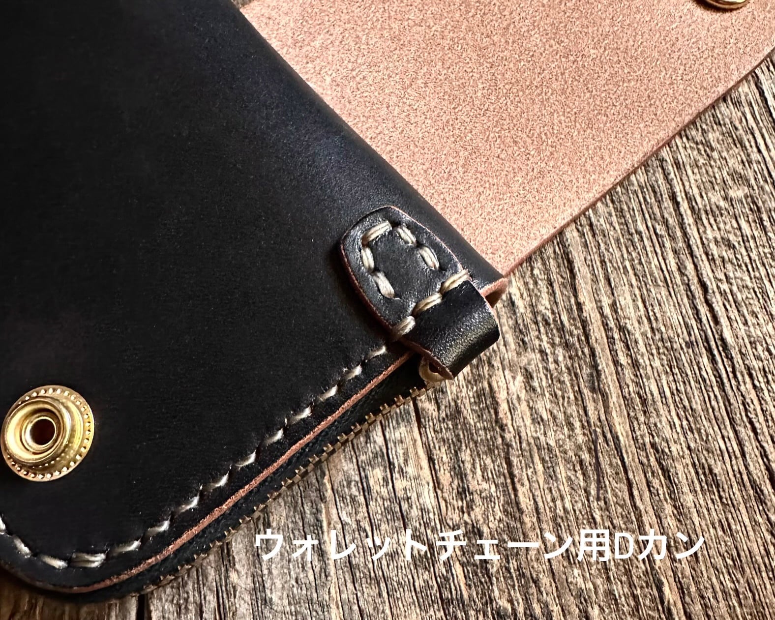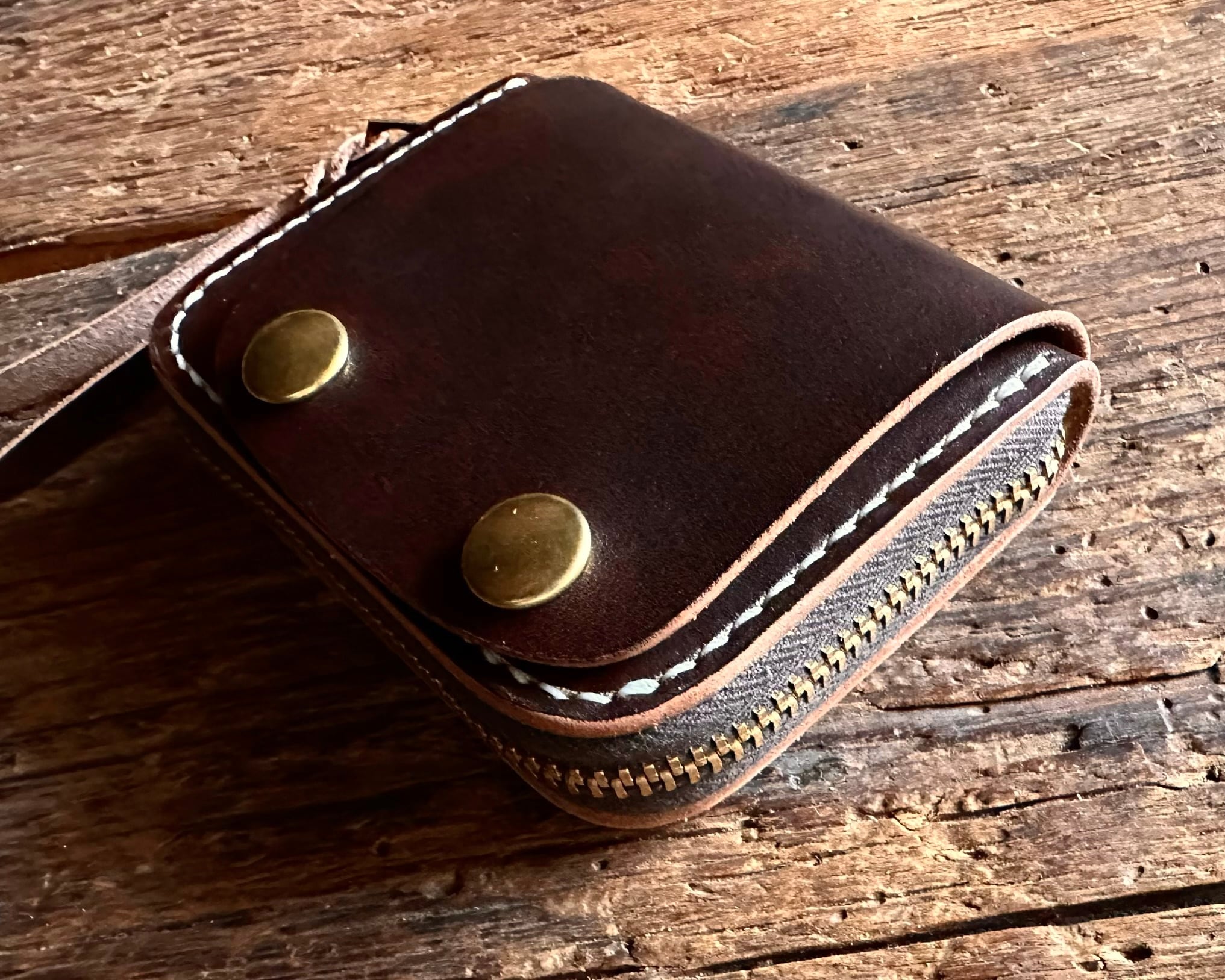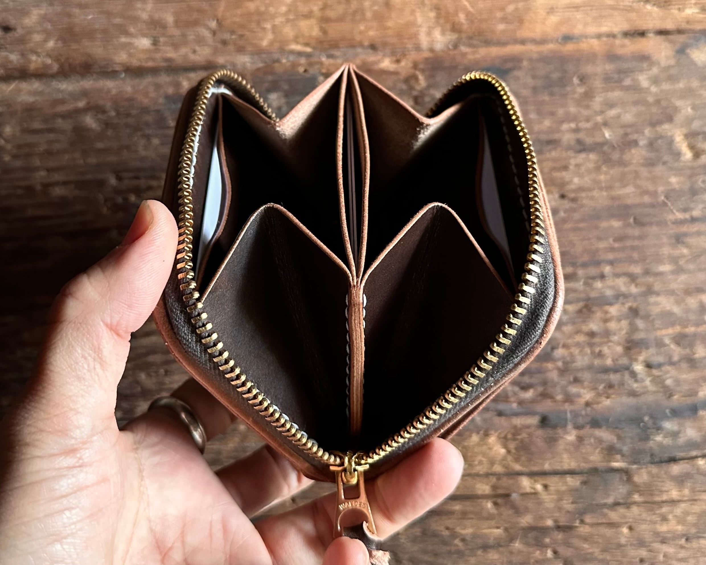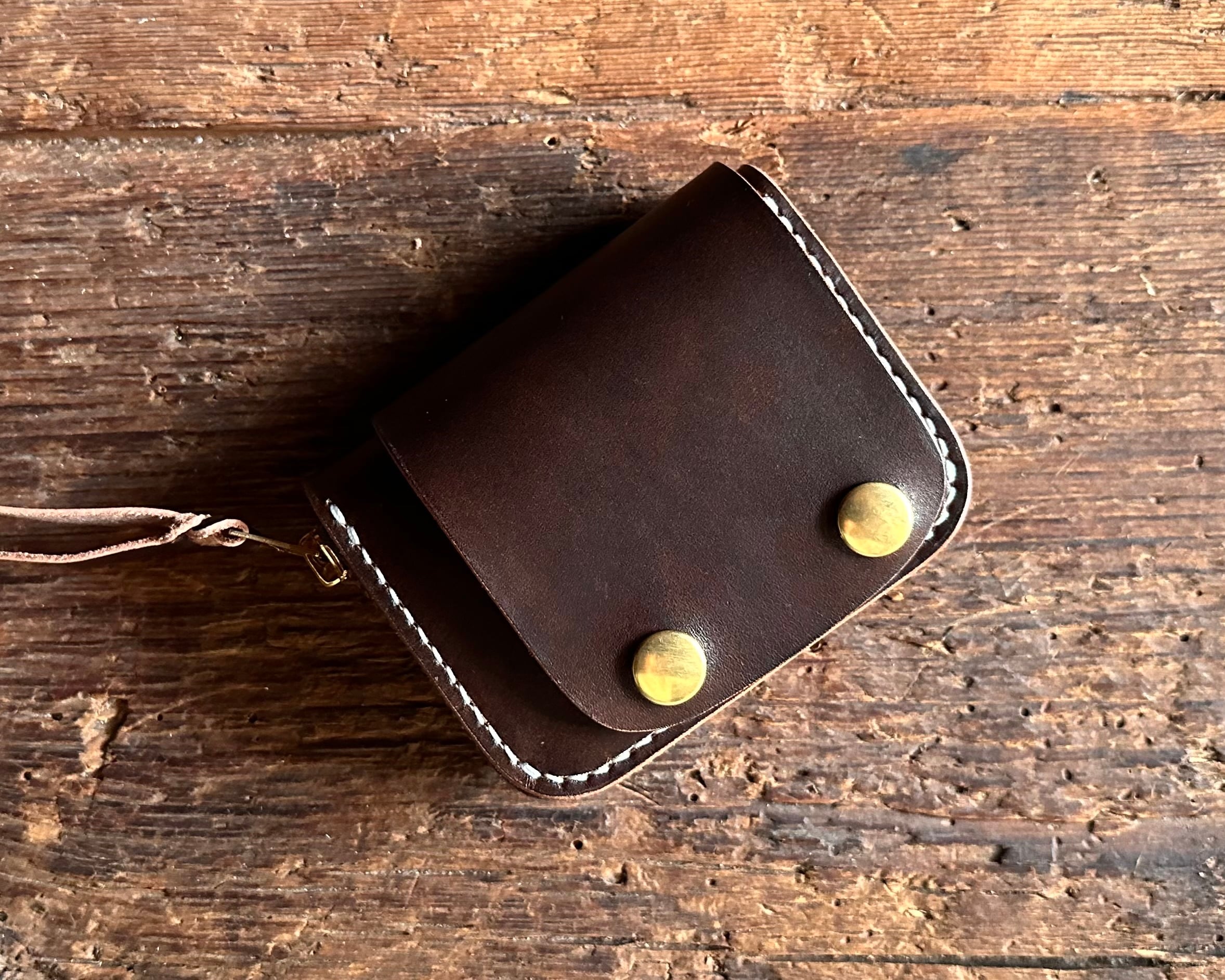 オールハンドメイド総手縫いで仕上げたラウンドジップミニウォレットです。