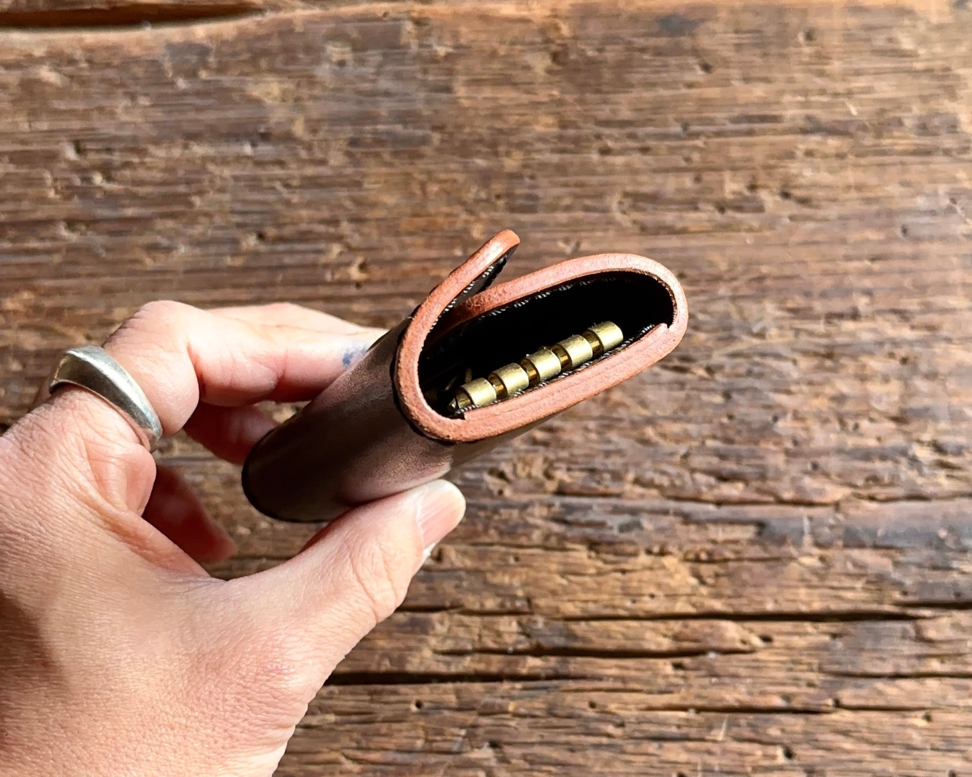 使用しております革はピット層での植物タンニン鞣しの上質な牛革ですので、耐久性に優れ、美しい経年変化が特徴です。
